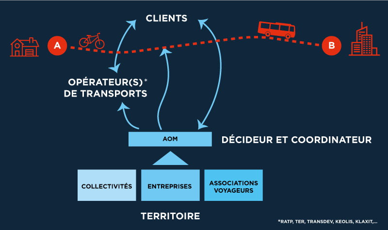 Ainsi, en Ile-de-France, l’Autorité Organisatrice des Mobilités (AOM) gère le processus d’ouverture à la concurrence pour les transports publics assurés par la RATP, la SNCF (Transilien) et les compagnies de bus OPTILE (Organisation Professionnelle des Transports d’Ile-de-France).