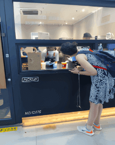 Le dernier point de vigilance nous ramène à Luckin Coffee. Ne pas prioriser la relation avec l’agent au contact a priori, soit – mais il ne convient pas pour autant d’empêcher la relation lorsqu’elle devient opportune. La photo ci-dessous nous ramène presque aux hygiaphones administratifs, largement critiqués pour leur manque d’ergonomie communicationnelle. Chez Luckin, clairement, les vitres ouvertes à hauteur de mains étaient adaptées à la délivrance des cafés, mais pas à la communication verbale. L’aménagement du lieu de service était tellement pensé contre la relation que l’employée au contact a dû surmonter des obstacles physiques (en l’occurrence elle a fini par sortir de la boutique) pour aider le client. Ne pas prioriser la relation ne doit pas être confondu avec le fait d’aller à l’encontre de celle-ci !